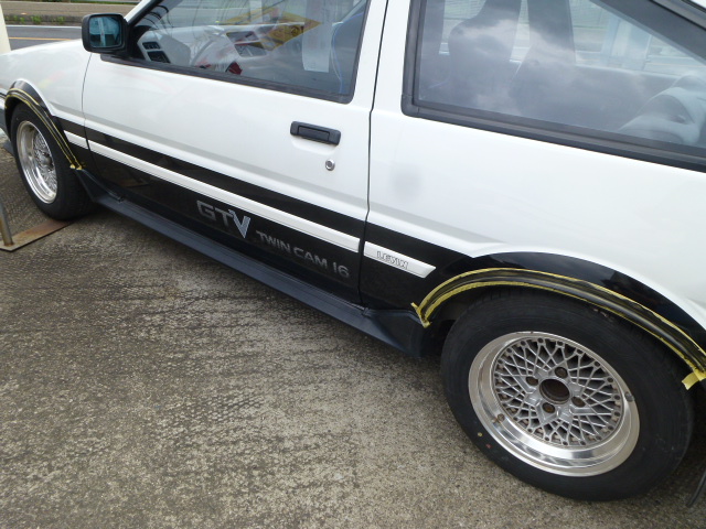 2020年6月18日 (木) | スタッフブログ 茨城県K様 ご成約AE86レビン 納車点検もほぼ終わりましたので外装のお手入れをしました。 フェンダーも綺麗にしたのでモール付き車の弱点でも有るモール周りの錆び予防をしました。 サイドモールとボディの隙間をブラックのシールで埋めました。