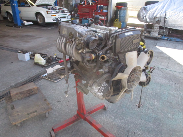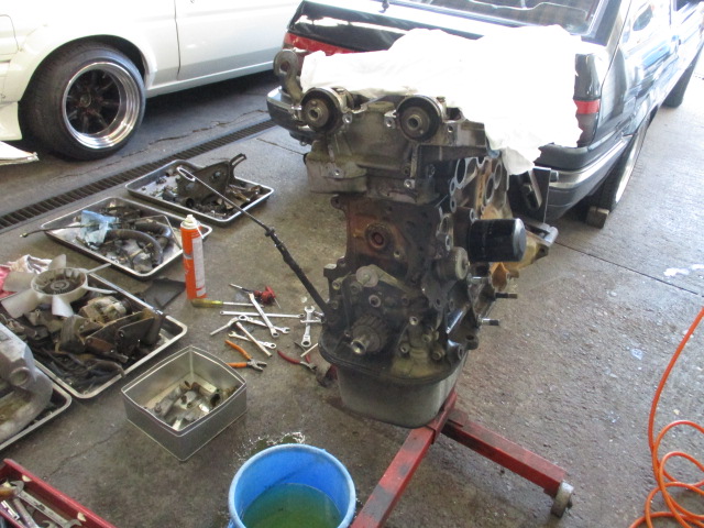 エンジンスタンドに移してエンジン廻りの補器類等を取り外していきます。