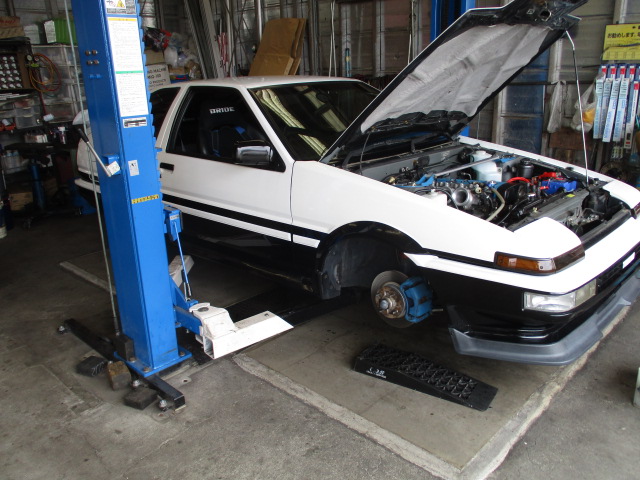 2022年9月11日 (日) | スタッフブログ 県内J様 お預かりAE86トレノ 車検でのお預かりです。 キャリパーがデカい!! 190ps仕様なのでブレーキのグレードアップは必須ですね。 ちなみにキャリパーはインテ98スペック用です。