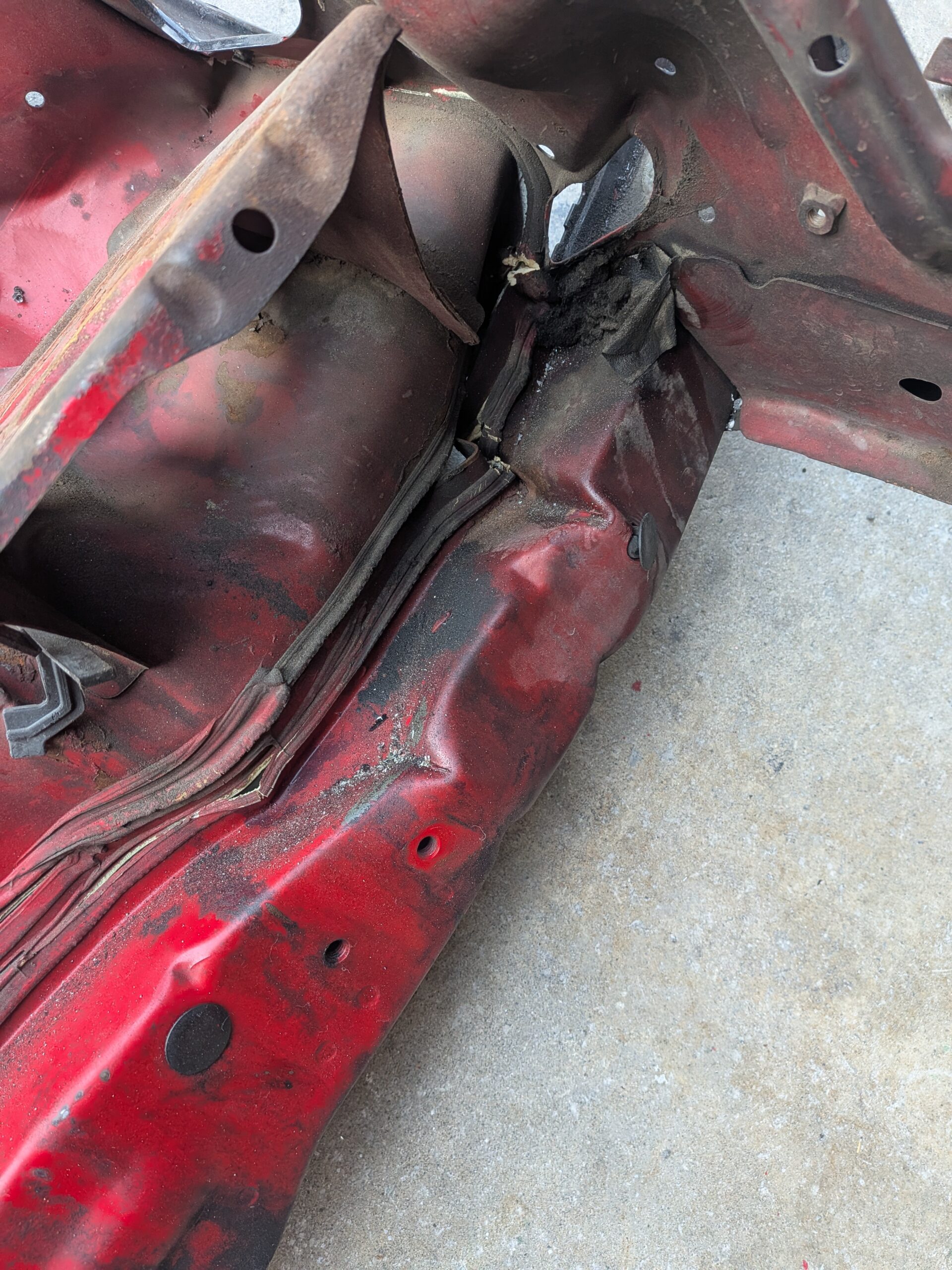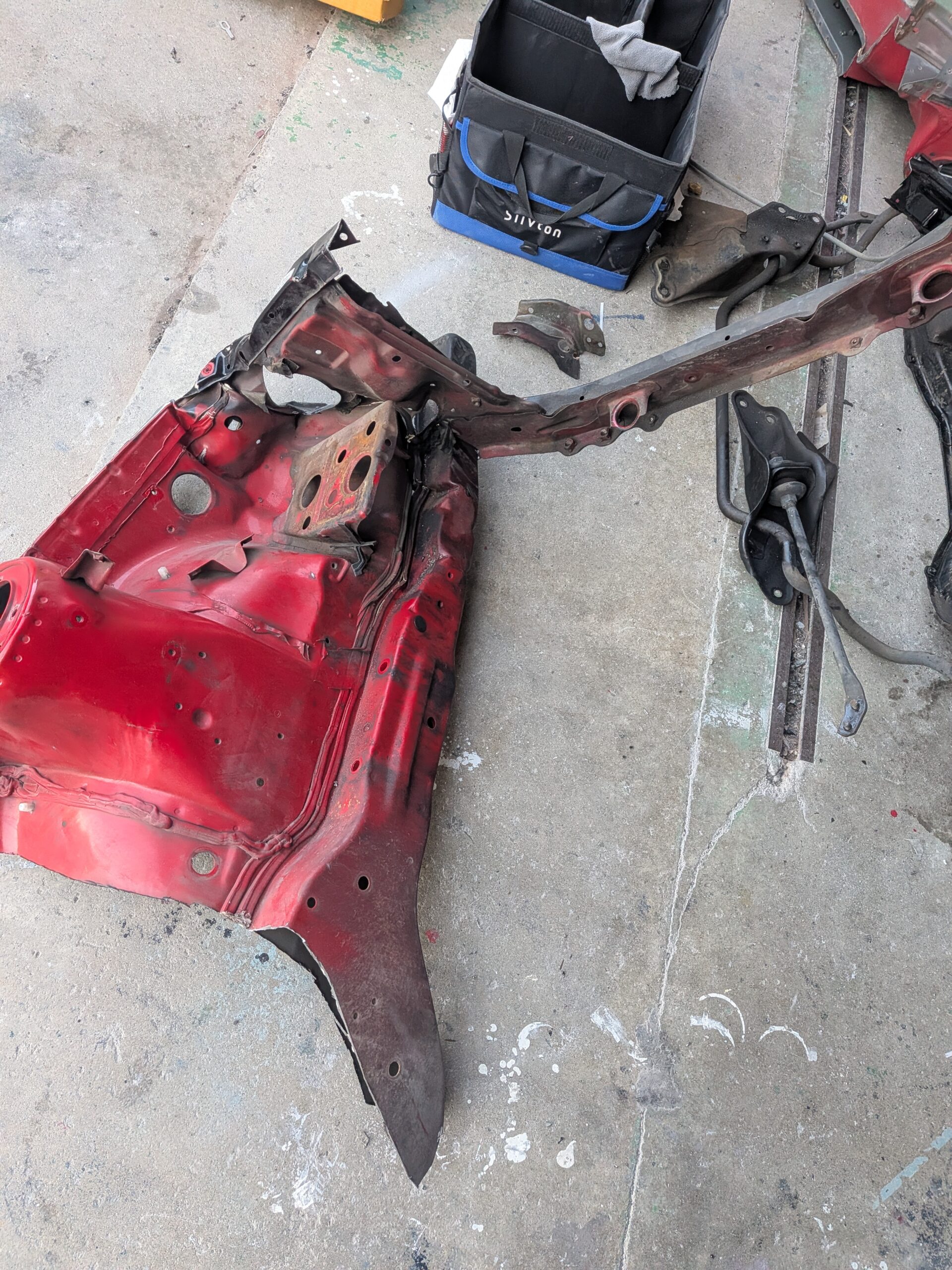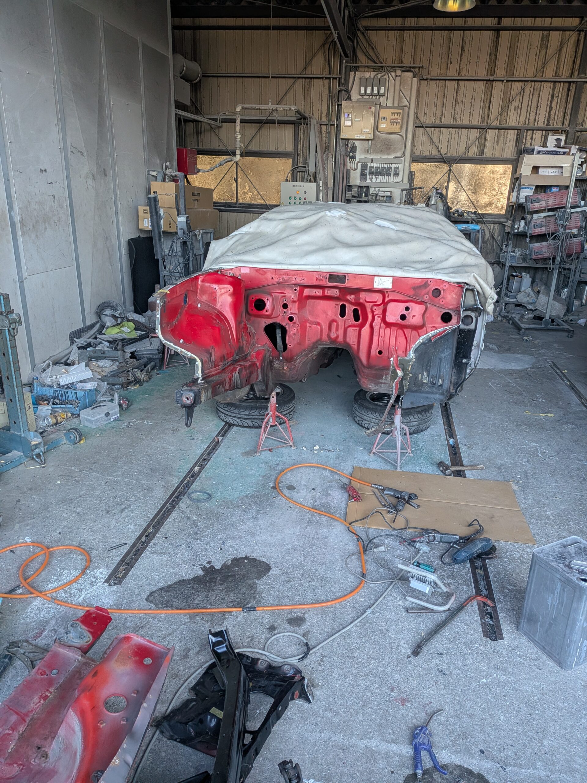 2026年1月13日 (火) | スタッフブログ 東京都O様 お預かりAE86レビン 鈑金修理 取り外した左フロントサイドフレーム ドナーから切り外したサイドフレームを仮合わせして 正規の位置に合わせます。 クロスメンバー、ライトバッフル、コアサポートは今回も レストアパーツさんの部品を使用して修正していきます。 続く。