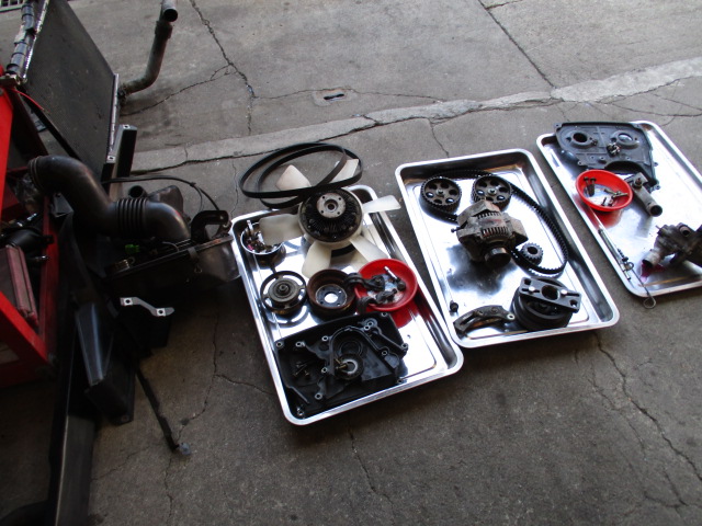 タイミングベルト一式、ウォーターポンプ、オイルシール等を交換です。
