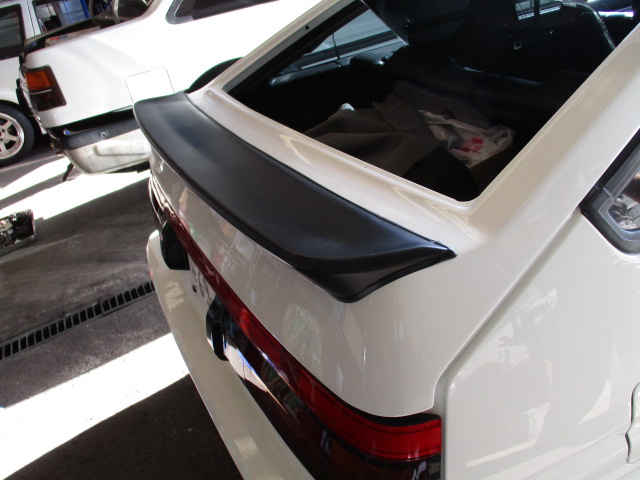 2018年7月2日 (月) | スタッフブログ 静岡県K様 お預かりAE86レビン リア周りの板金塗装でお預かりです。 今回リアゲートはFRP製の物に交換しました。 純正のリアスポイラーも装着しガラスをはめ込むのみです。