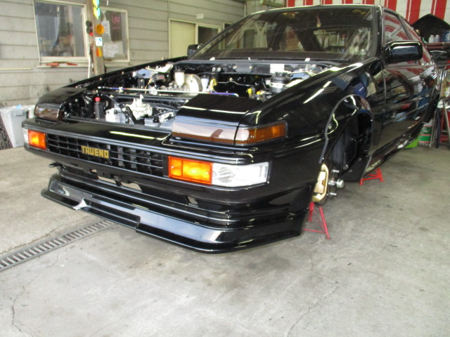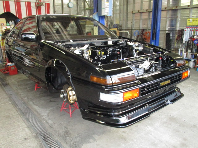 2018年9月24日 (月) | スタッフブログ, レストア情報 AE86トレノ ブラックリミテッド仕様セミレス ヒーターワイヤー、プレートは新品に交換します。 オルタ、パワステポンプはリビルト品を取り付けます。 ペラシャフトのサポートベアリングも新品に交換し取り付けました。 最後はフロントバンパー レンズ類はランプ、ガーニッシュも含め新品です。 バンパーが付くとかなり形になりますね! カッコイイです!!