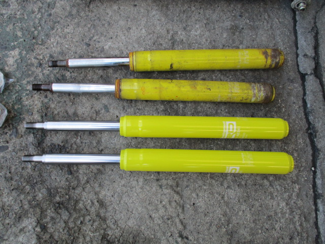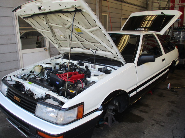 2017年3月11日 (土) | オーナーズクラブNEWS 県内O様 お預かりAE86レビン 走行会、オフ会に向けて?リフレッシュ作業です。 ショックは前後TRDに交換 フロントは現状も92ショートでした。 リアは定番の青色 ピロアッパーマウントも新品に交換です。 で、車高は今までより1cmぐらいダウンしましたので 合わせてフロントも幾度となく調整し こんな感じです。