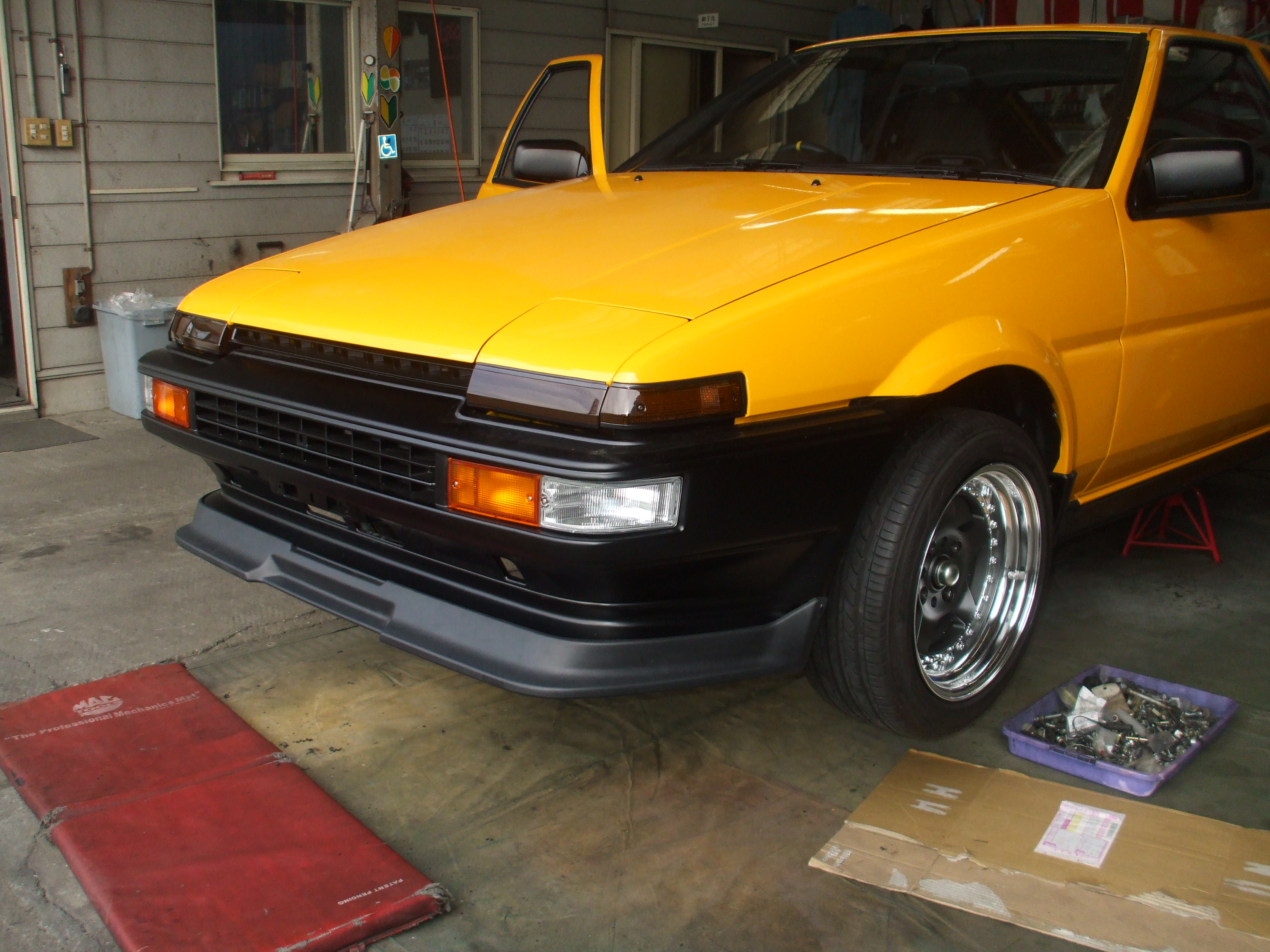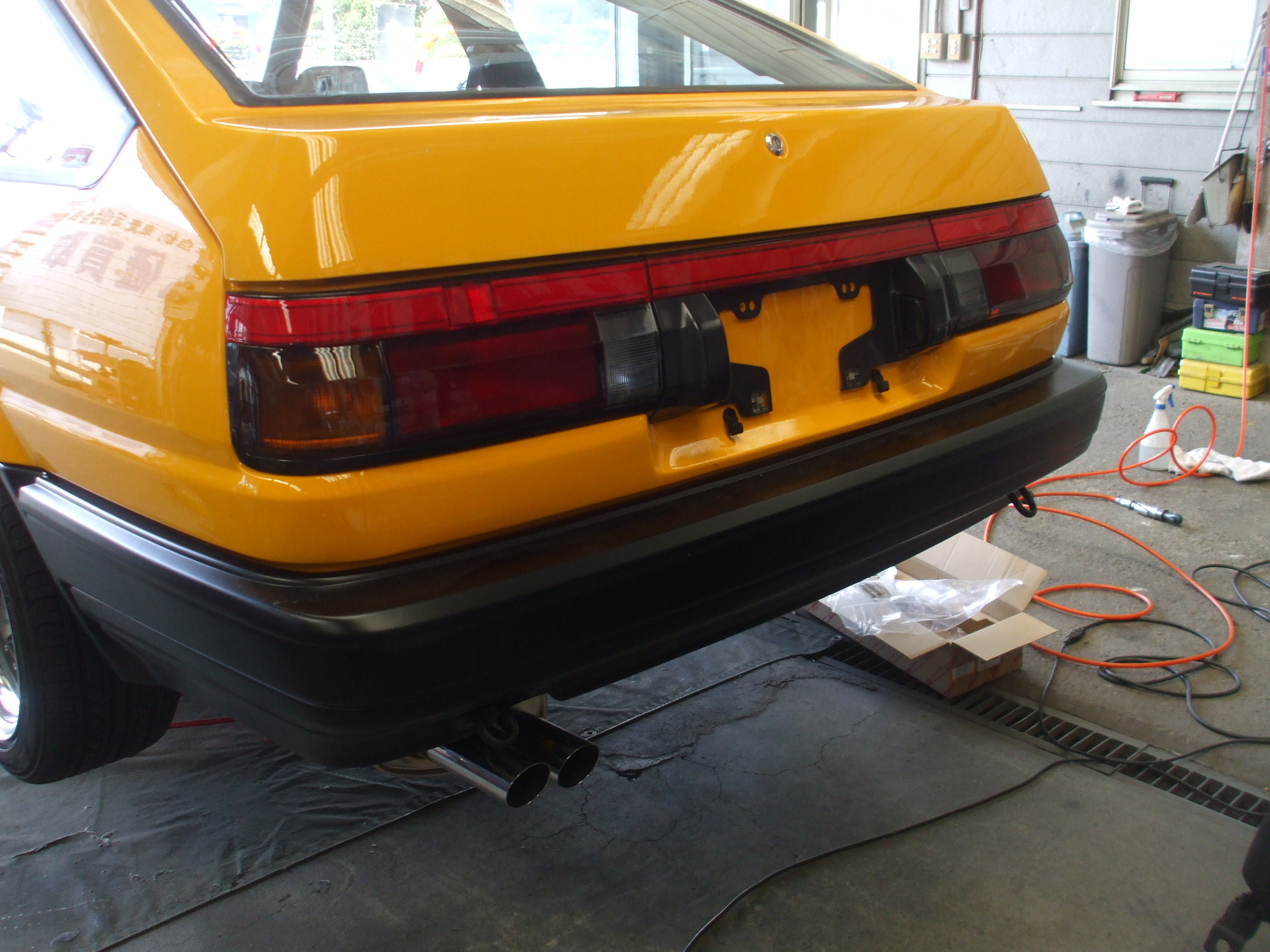 2016年3月31日 (木) | レストア情報 AE85トレノ 20バルブ セミレス ウォッシャーノズルも新品に交換します。 ワイパーアームも左右新品に マフラーはW出しの60パイ、デフ上の新品を取り付けました。 テールレンズもガスケットを含め左右新品を取り付け。 フロントリップも新品を取り付け シートも左右装着しました。 明日、細かな部分の作業をして完成です!!