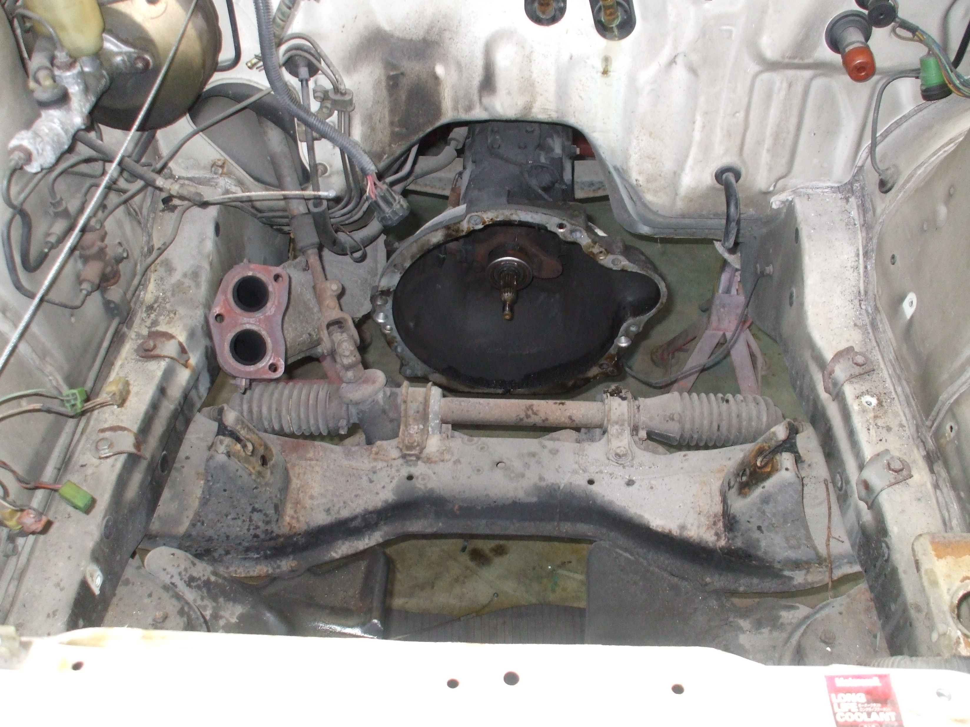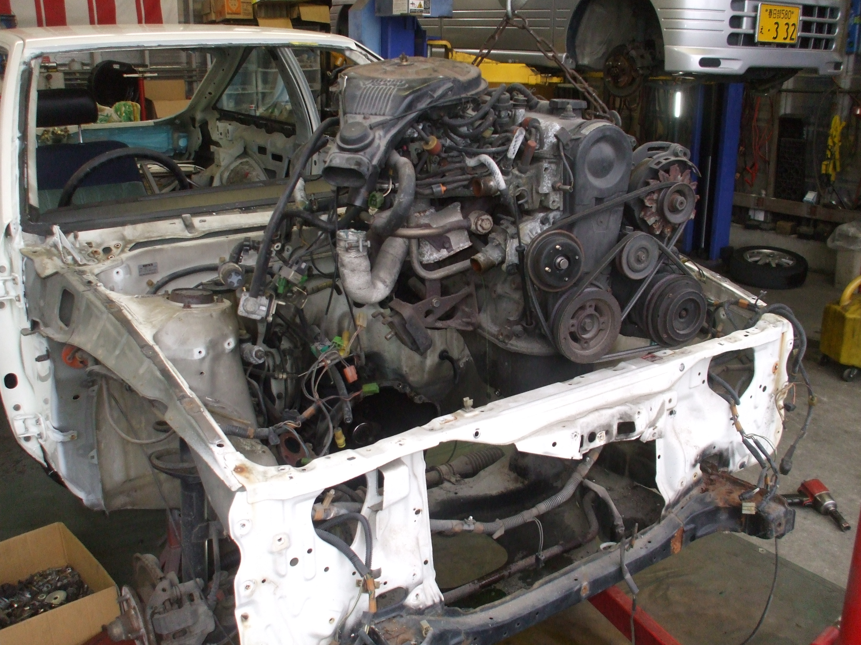 2016年4月2日 (土) | レストア情報 AE85トレノ3ドア白/黒 20バルブ セミレス ひたすら取り外しです。 フレームに大きなダメージはありませんが フロントメンバーは交換した方がよさそうです。