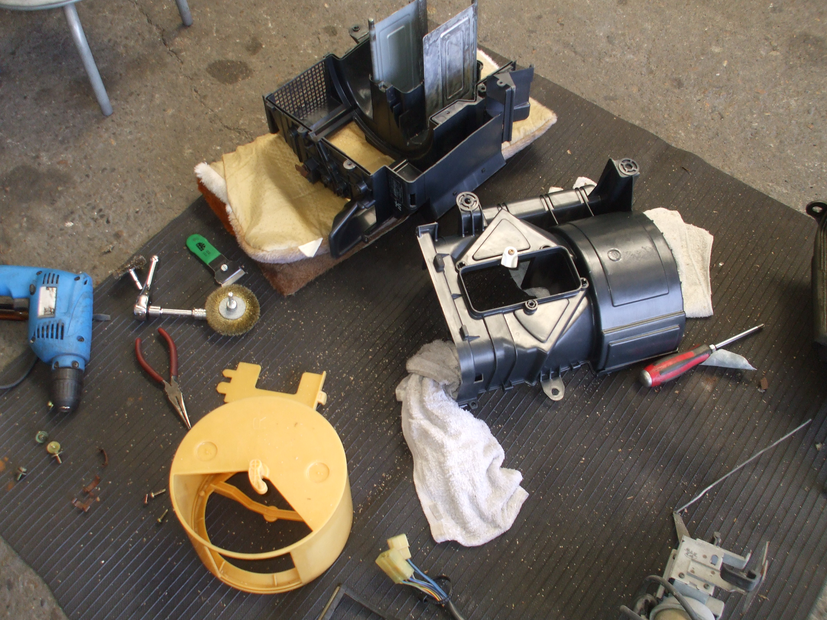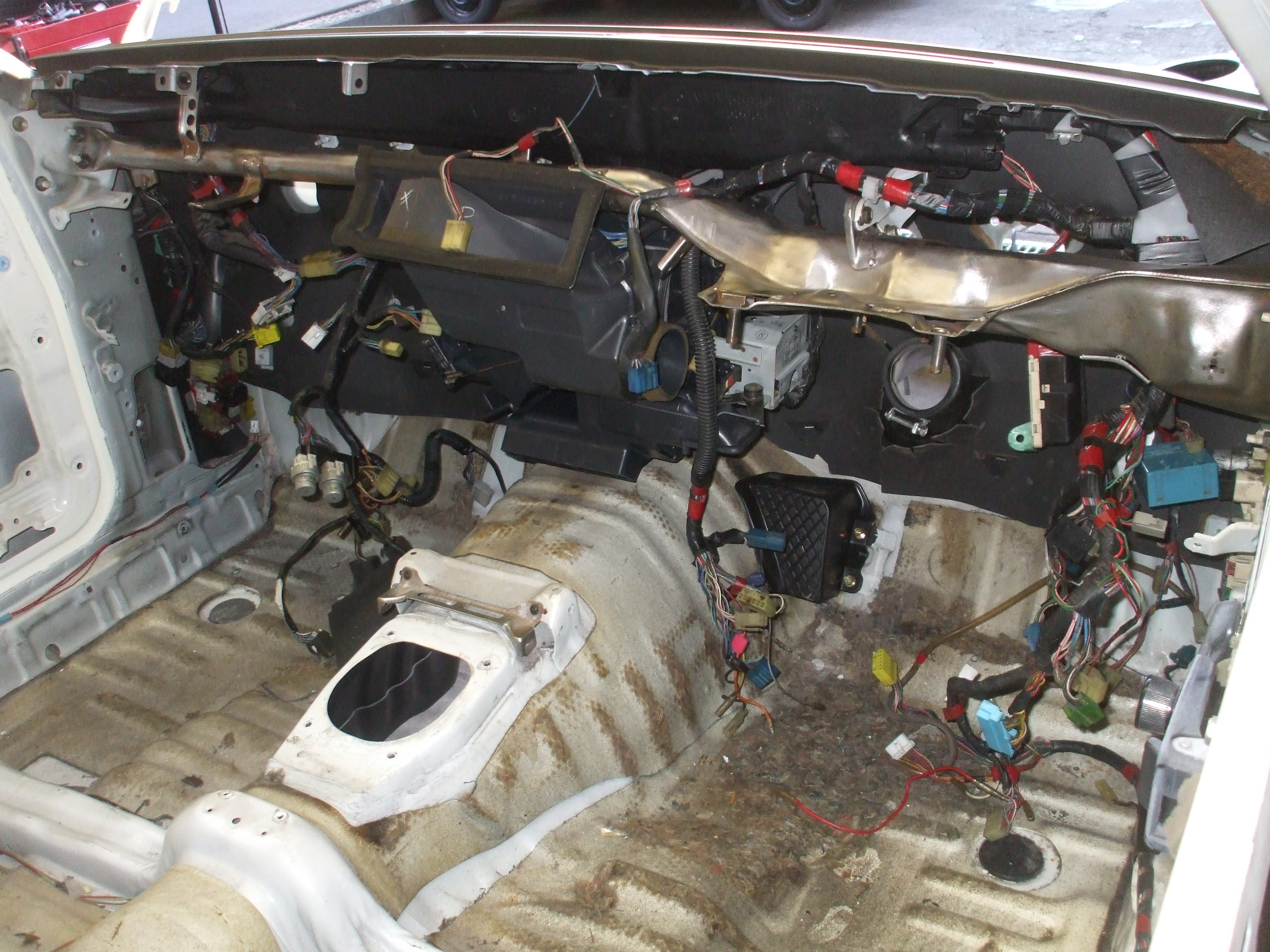 2016年4月15日 (金) | レストア情報 AE85トレノ3ドア白/黒 20バルブ セミレス ヒーターケースの洗浄です。 デフロスターのケースも分解して洗浄します。 ここもこのような作業でないと外さないですよね。 この部分も結構汚れてます。 室内の配線を取り付け、パイプも取り付けしました。 今回、オートエアコン仕様になるのですが マニュアルエアコンと比べるとカプラーの数が多いですね。