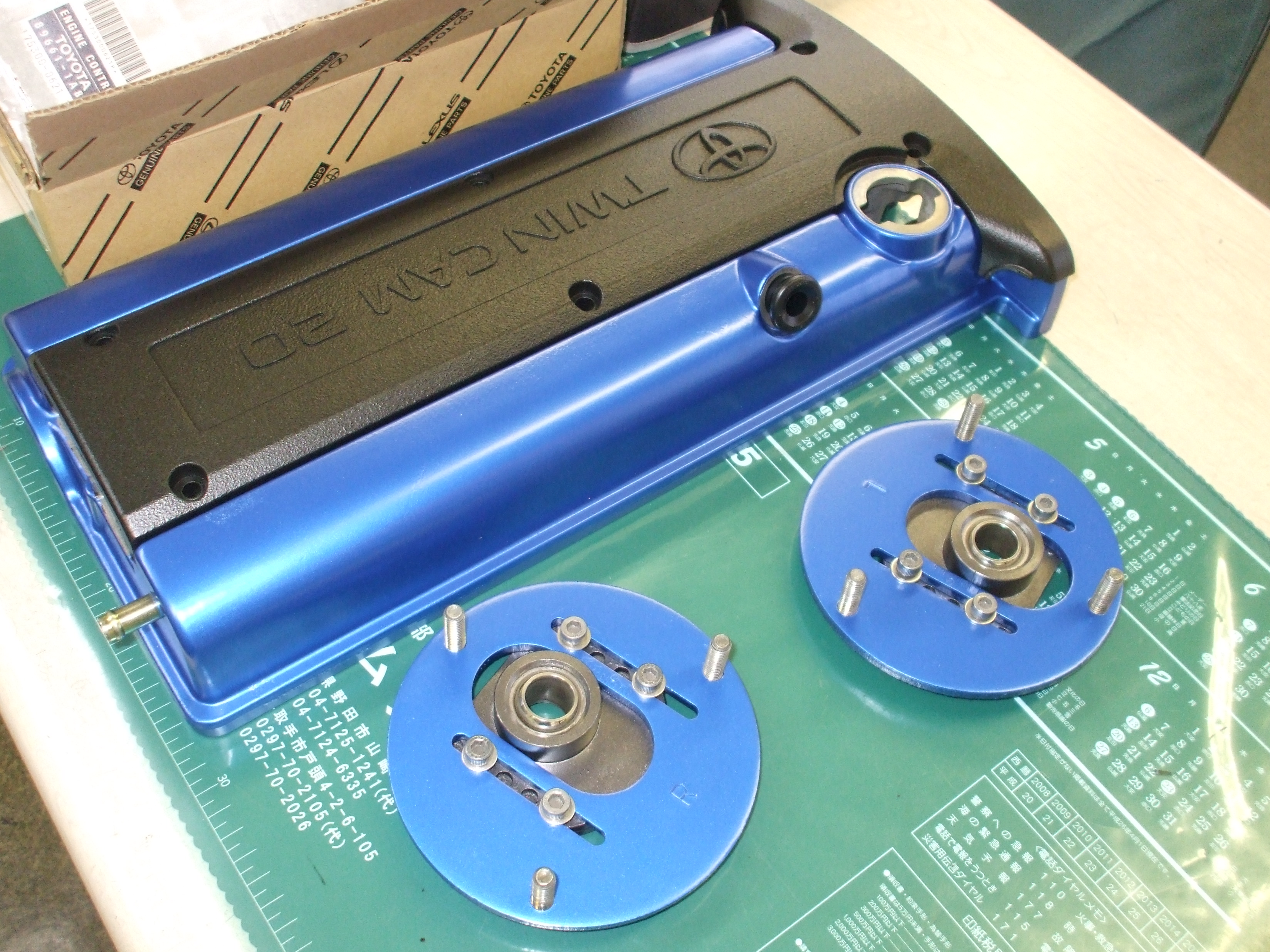 2016年4月23日 (土) | レストア情報 AE85トレノ3ドア白/黒 20バルブ セミレス この車両は東京都のM様でご成約頂きました。 ありがとうございました。 M様のご希望でヘッドカバーはブルーで塗装致しました。 ピロアッパーマウントも同色で塗装致しました。 PCバルブが入るグロメットも新品に交換します。 オフ会には間に合いそうもありませんが、少しずつでも着実に進めてまいります。