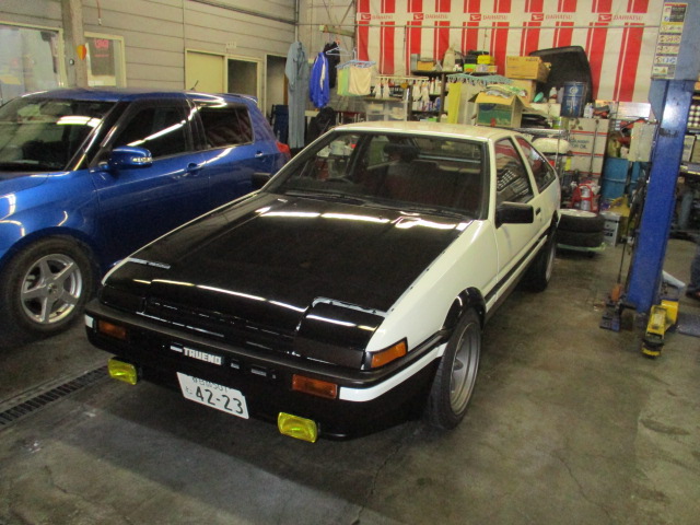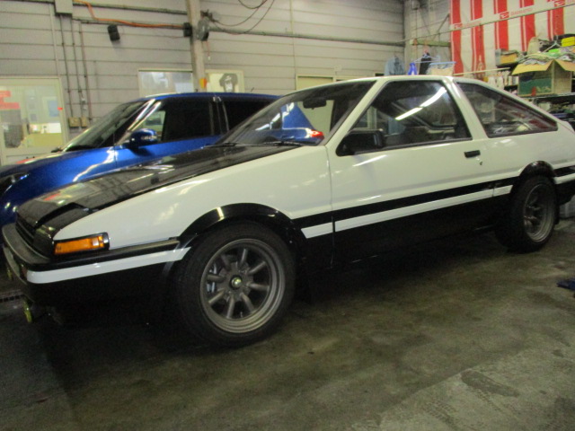 2017年1月17日 (火) | レストア情報 AE86トレノ3ドア1型イニD仕様セミレス 触媒、新品デフ上マフラーを取り付け、ミッション、デフオイルも注入完了です。 下廻りはこんな感じです。 車高を合わせて降りた状態がこんな感じです。 いい感じです。 やっぱり地面に降りると雰囲気が出てきました!