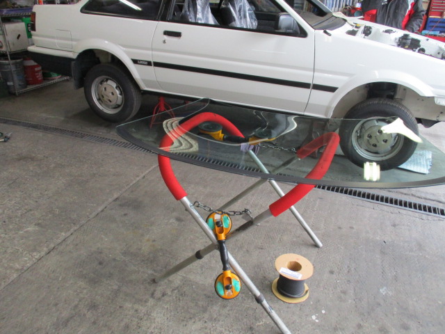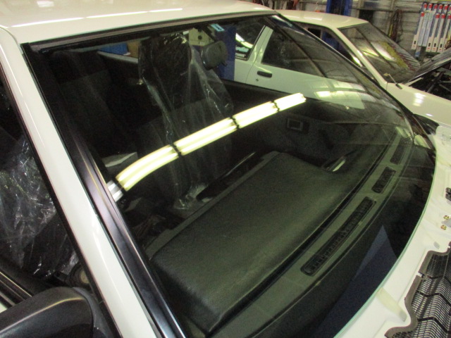 2017年3月7日 (火) | レストア情報 東京都N様 お預かりAE86レビン フロントガラスの取り付けです。 入れるガラスはクールベールです。 ガラス屋さんの作業です。 やっぱり色が通常より濃いですね。 クールベールを入れることにより車内温度も下がりますし 何より紫外線がカットできて暑い時のヒリヒリ感はなくなります。