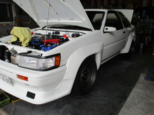 2017年7月25日 (火) | レストア情報 県内S様 ご成約AE86レビン オーバーフェンダーのリベット止めも終わり ホイルをつけてクリアランスの確認 調整前ではガッツリ前後ヒットしました! テンションロッドで左右を調整しタイヤハウスに当らないように調整・・・ 今度はフロントのオーバーフェンダーに当ってしまう為、 ワンオフにてステーを製作しバーフェンを外に押し出す形でやっと収まりました。 今回はこのようなことも想定してタイヤを50ではなく45にチョイスしておいて 本当に正解でした。 バーフェンもカットせずに済みました!